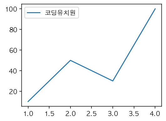 plt.plot([1,2,3,4],[10,50,30,100], label='코딩유치원')