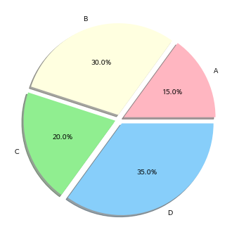 많은 옵션들이 있지만 labels, explodes, colors, shadow 정도면 충분할 듯 하여, 이것들만 다루었습니다.