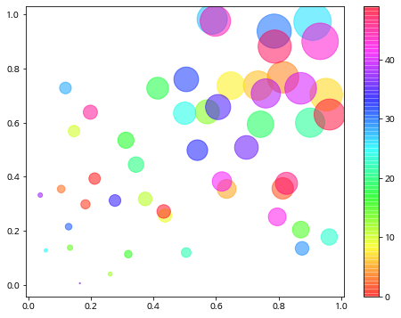 plt.scatter(x, y, s=area, c=colors, alpha=alpha, cmap='hsv')