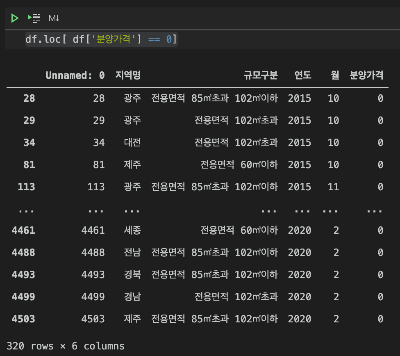 # '분양가격' 열에서 값이 0인 것들을 모두 출력