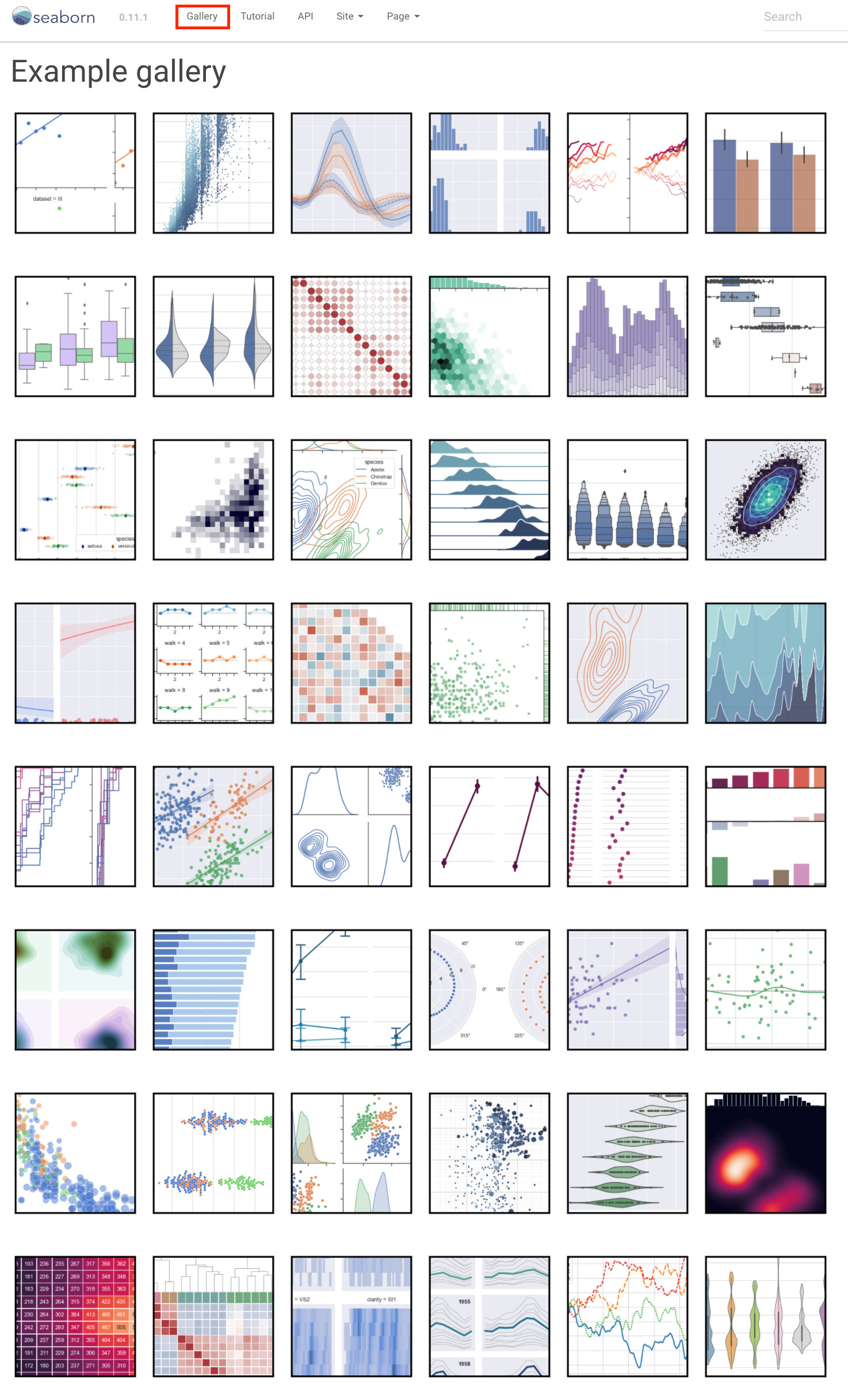 seaborn 공식 문서에 들어가서 Gallery 탭을 클릭해보면 다양한 종류의 그래프들의 예시를 볼 수 있습니다.