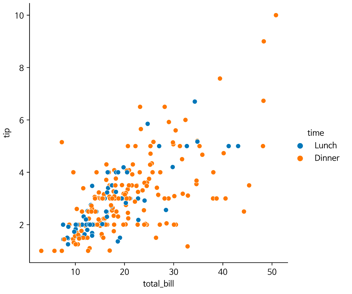 hue 파라미터에 범주형 데이터(Lunch/Dinner)의 컬럼명('time')을 입력함으로써 점심/저녁 식사에 따라 데이터를 구분해줄 수 있습니다.