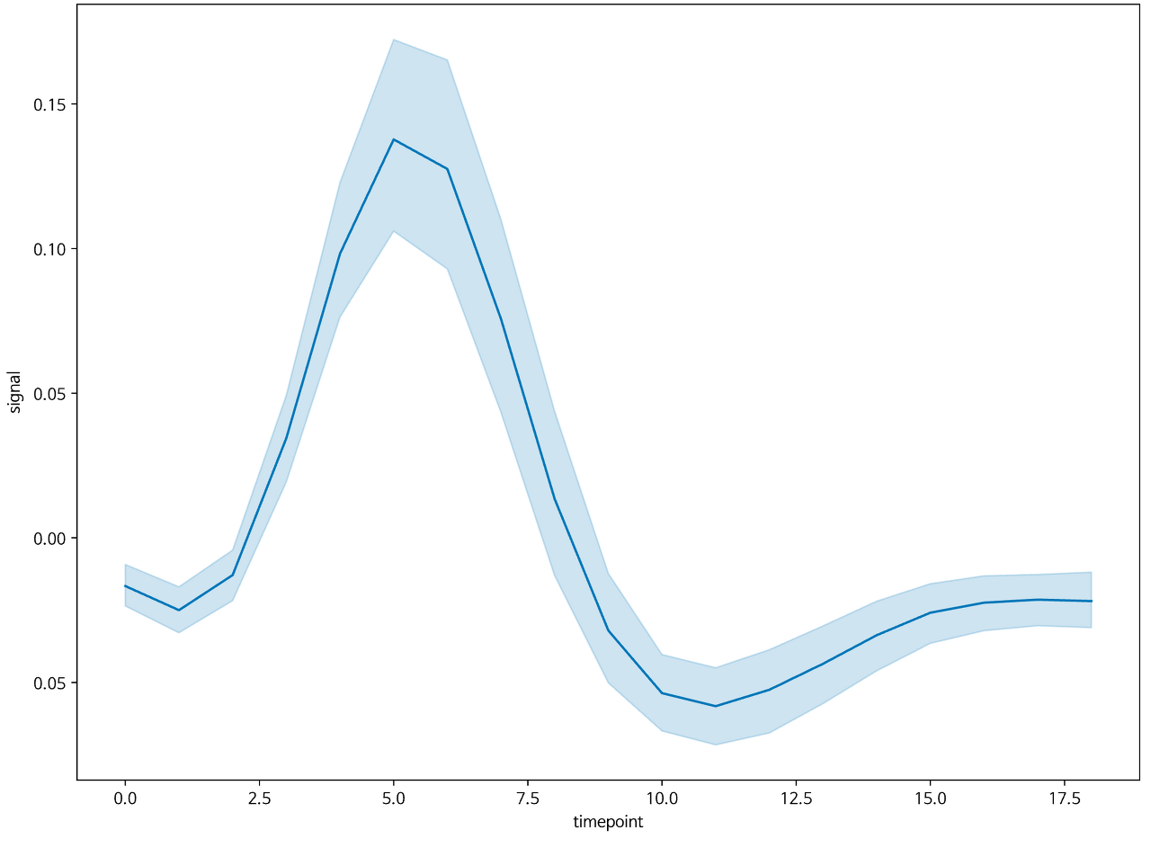 이러한 그래프는 seaborn 라인 그래프의 장점으로, 짙은 선은 추정 회귀선(Estimated regression line), 옅은 하늘색 영역은 신뢰구간(Confidence interval)을 나타냅니다.