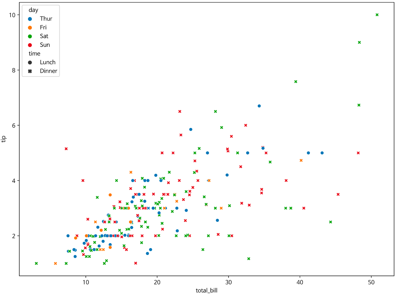 scatterplot은 정말 다양한 파라미터를 설정해줄 수 있지만 핵심적이라고 생각하는 hue와 style, 두 가지만 설명드리겠습니다.