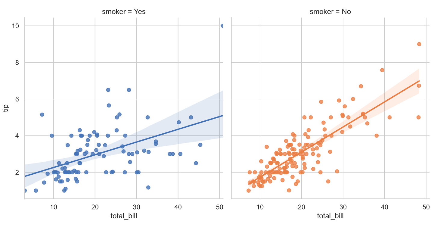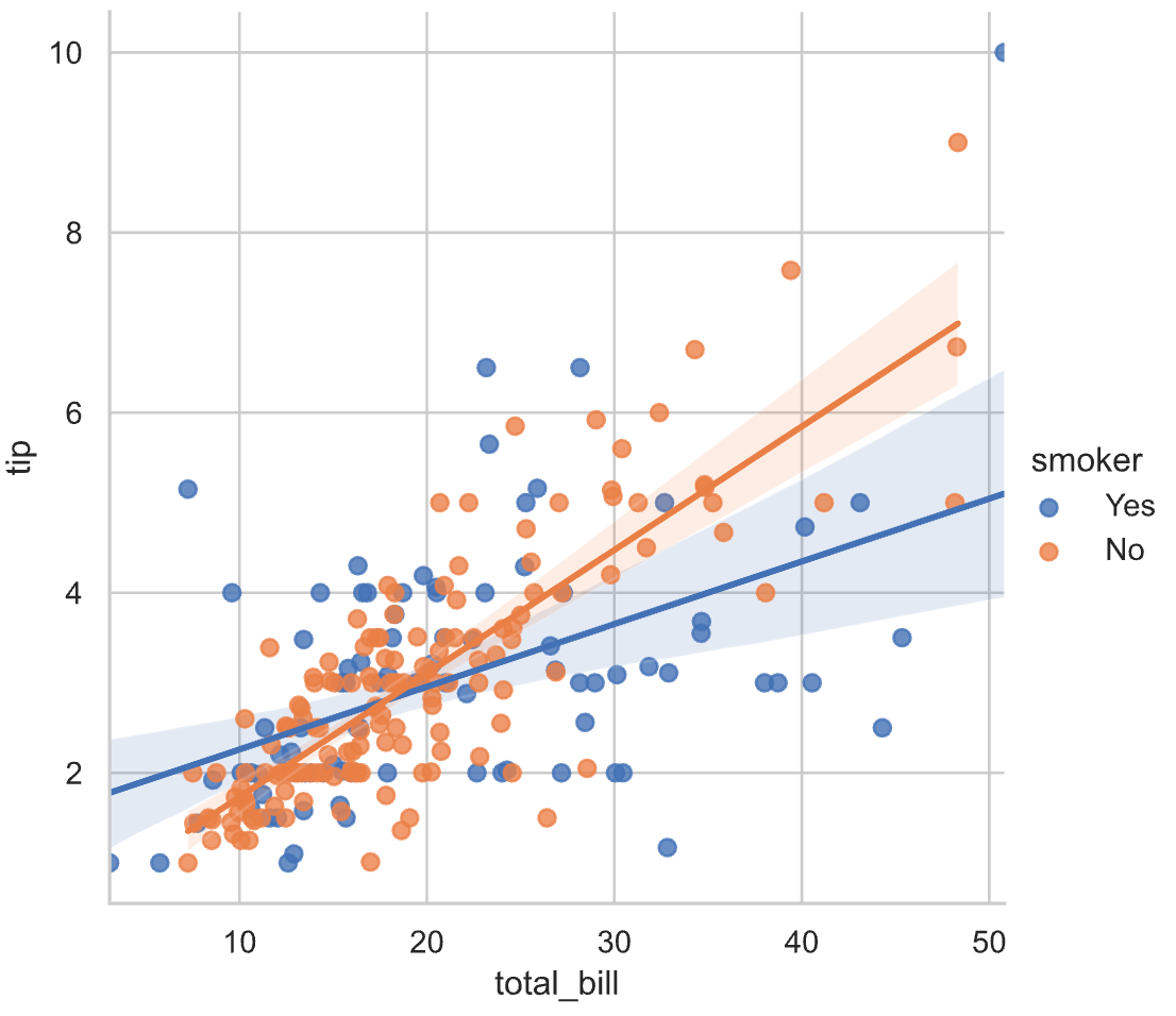 데이터 점들의 경향을 나타낸 선형 회귀선을 보았을 때, 비흡연자들이 비교적 팁을 많이 지불한 것으로 보입니다. (큰 총액에서 차이가 많음)