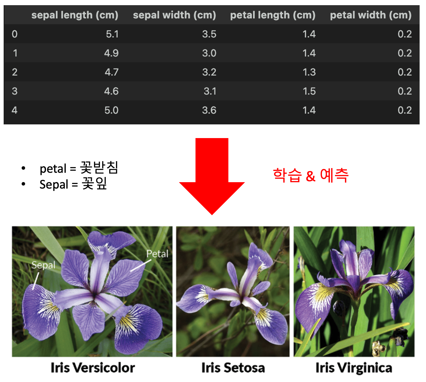 오늘은 지난 시간 준비한 학습 데이터와 검증 데이터를 이용해서, 붓꽃의 3가지 종류로 분류해보는 머신러닝을 실습해보겠습니다.
