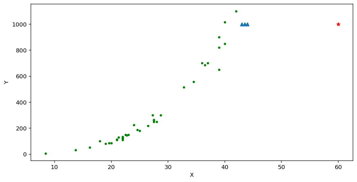 하지만 K-최근접 이웃 알고리즘으로 모델을 학습시키고, 60이라는 값을 입력시키면 가장 가까운 3개의 데이터의 Y값 평균(대략 1000)을 예측합니다.