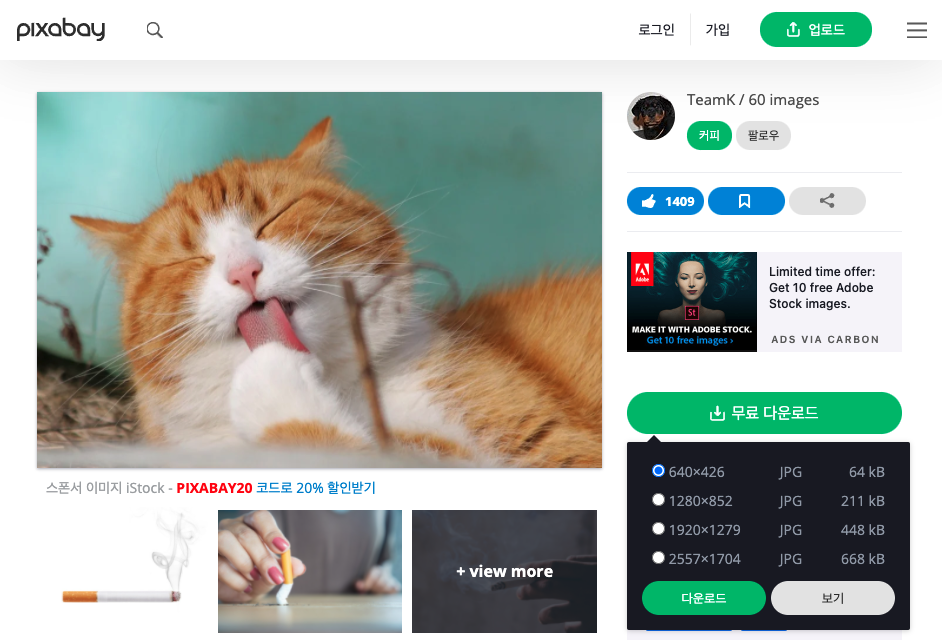 해당 링크에 접속하셨으면 검색창에 고양이를 검색하고 아래의 이미지를 다운로드해주세요. 사진 사이즈는 가장 작은 640x426 사이즈로 받아볼게요.