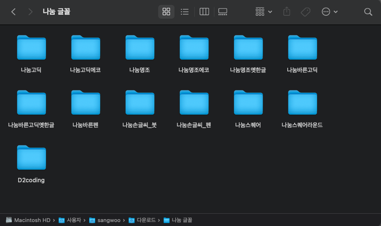 저는 아래의 여러 글꼴들 중에서 나눔손글씨_펜 폴더 안의 NanumPen.ttf 파일을 선택했습니다.