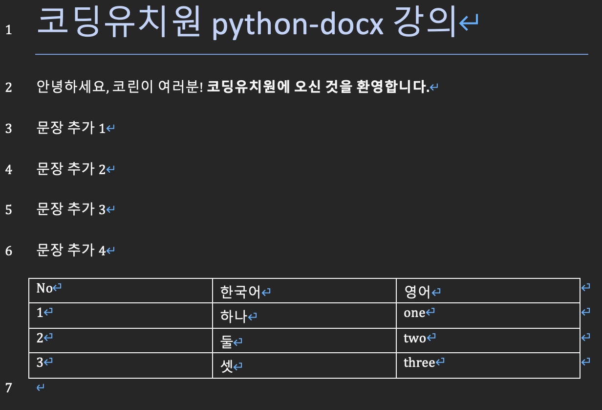 지난 두 시간에 걸쳐서 python-docx 라이브러리로 워드 파일에 글자, 그림, 표를 삽입하는 방법을 배워봤습니다.