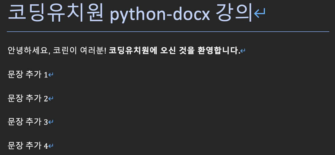 p = document.add_paragraph('안녕하세요, 코린이 여러분!')