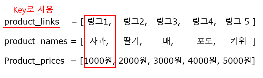 Key는 중복을 허용하지 않으므로, 중복되지 않을만한 제품 링크 주소를 Key로 사용해줍시다.