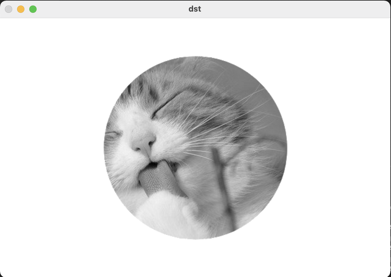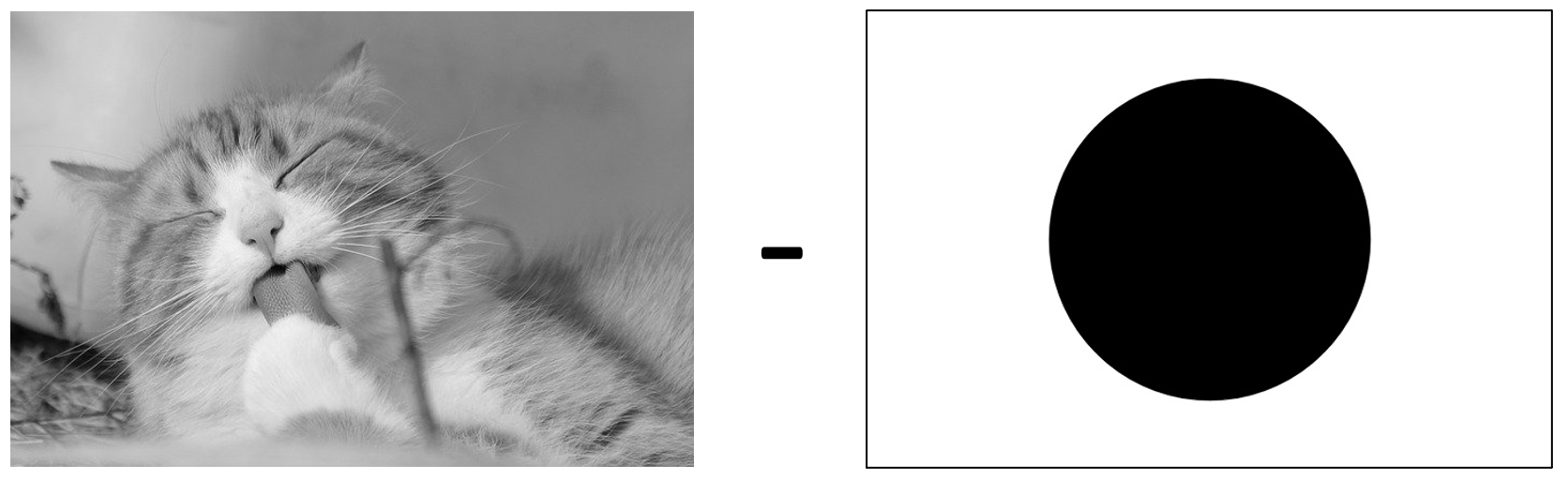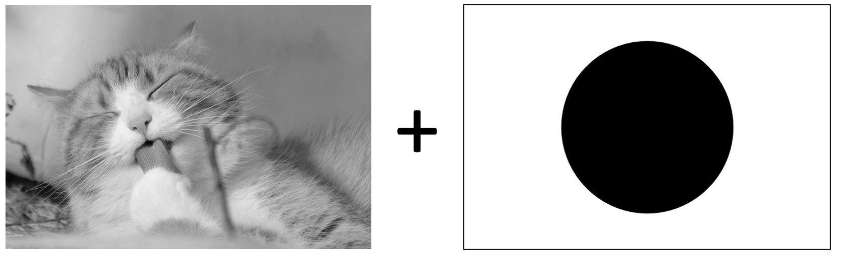 그레이스케일 영상에서 검은색은 0, 흰색은 255의 값을 가지므로, 검은색 원이 있던 부분은 원래의 고양이 사진을 그대로 출력하며, 흰색이었던 부분은 모두 흰색으로 출력되는 것을 확인 하실 수 있습니다. 참고로 두 이미지의 픽셀값을 더했을 때 255를 넘으면 모두 255(흰색)으로 출력됩니다.