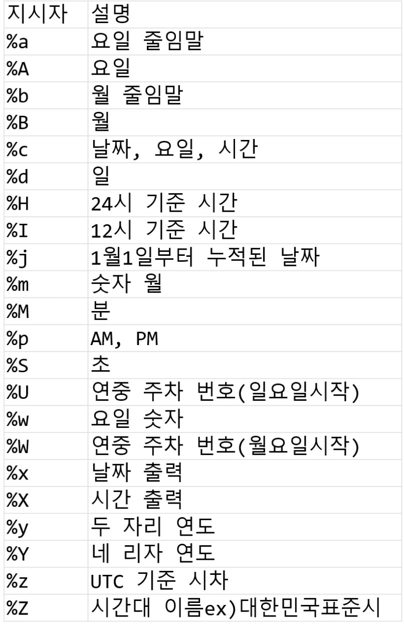 위에서 보라색으로 표현된 문자열들은 아래의 표를 참고하셔서 여러분들이 원하시는 시간 표현 방식을 선택하실 수 있습니다.