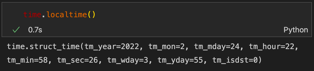 앞에서 배운 gmtime( )이 세계의 기준 시간이라면 localtime( )은 현재 코드를 실행한 사람이 위치한 지역 기준의 시간이 struct_time으로 출력됩니다. 저는 주로 이 함수를 자주 사용한답니다.