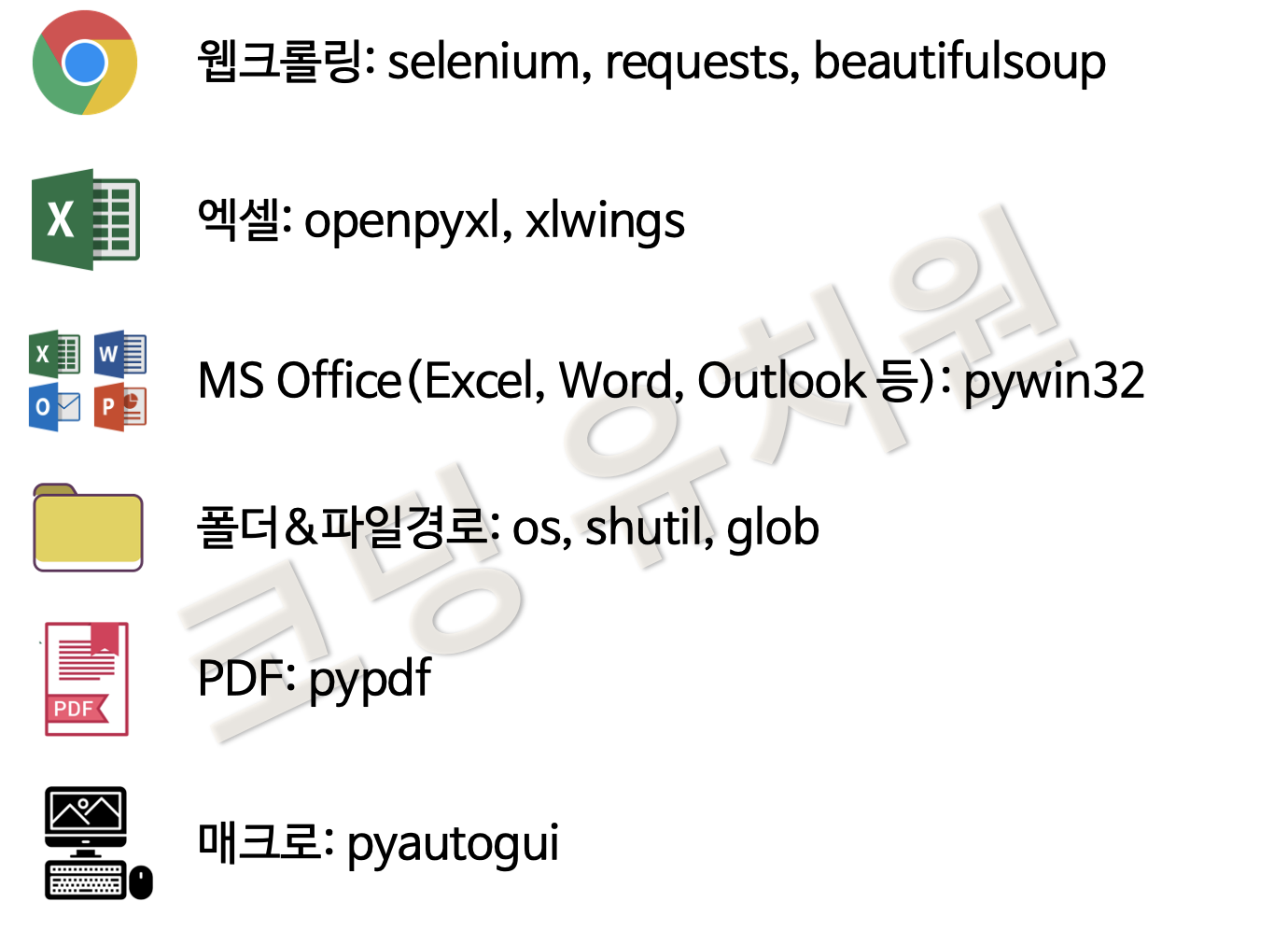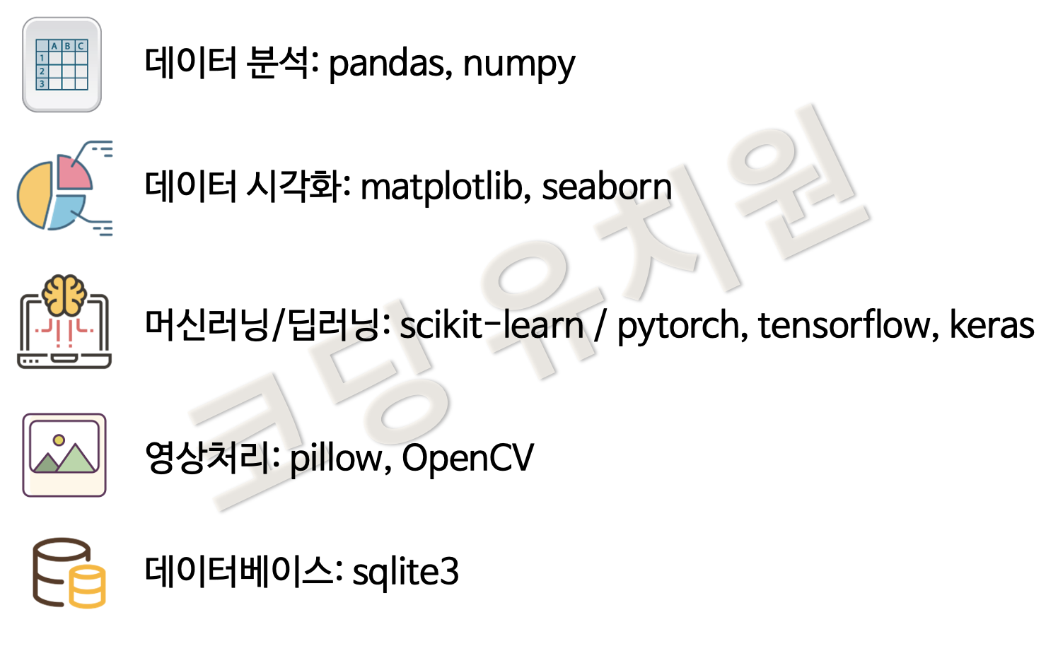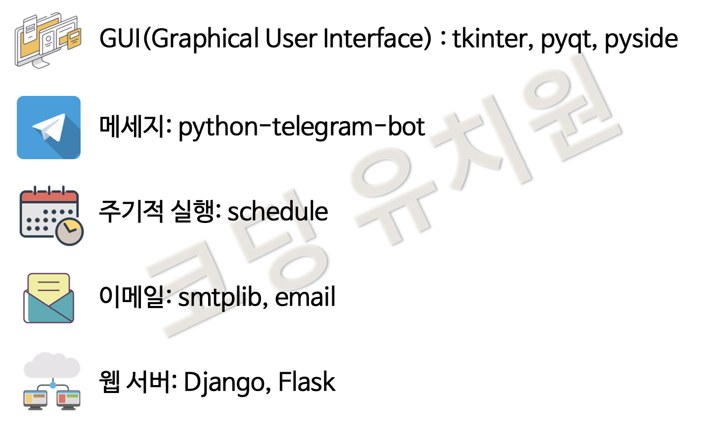 오늘은 파이썬의 가장 큰 장점인 다양한 라이브러리(혹은 패키지)라고 하는데, 어떤 라이브러리들이 있는지 보기 쉽게 정리해보았습니다.