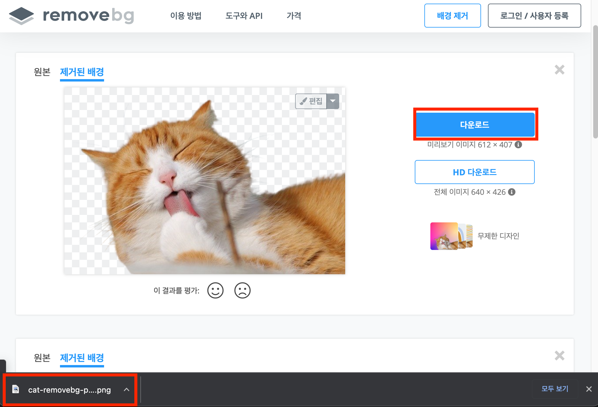 위의 방법으로 이미지를 업로드 하면 아래와 같이 배경이 제거된 사진이 나오며, 다운로드 눌러주시면 브라우저 창 아래에 다운로드된 이미지 파일이 표시됩니다.