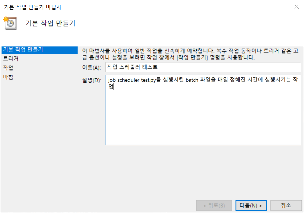 step3. 아래와 같은 화면이 나오면 해당 작업을 잘 표현할 수 있는 이름을 입력하고, 필요하다면 간단히 설명도 넣어주세요. 모두 입력하셨다면 다음 버튼을 클릭해주세요.