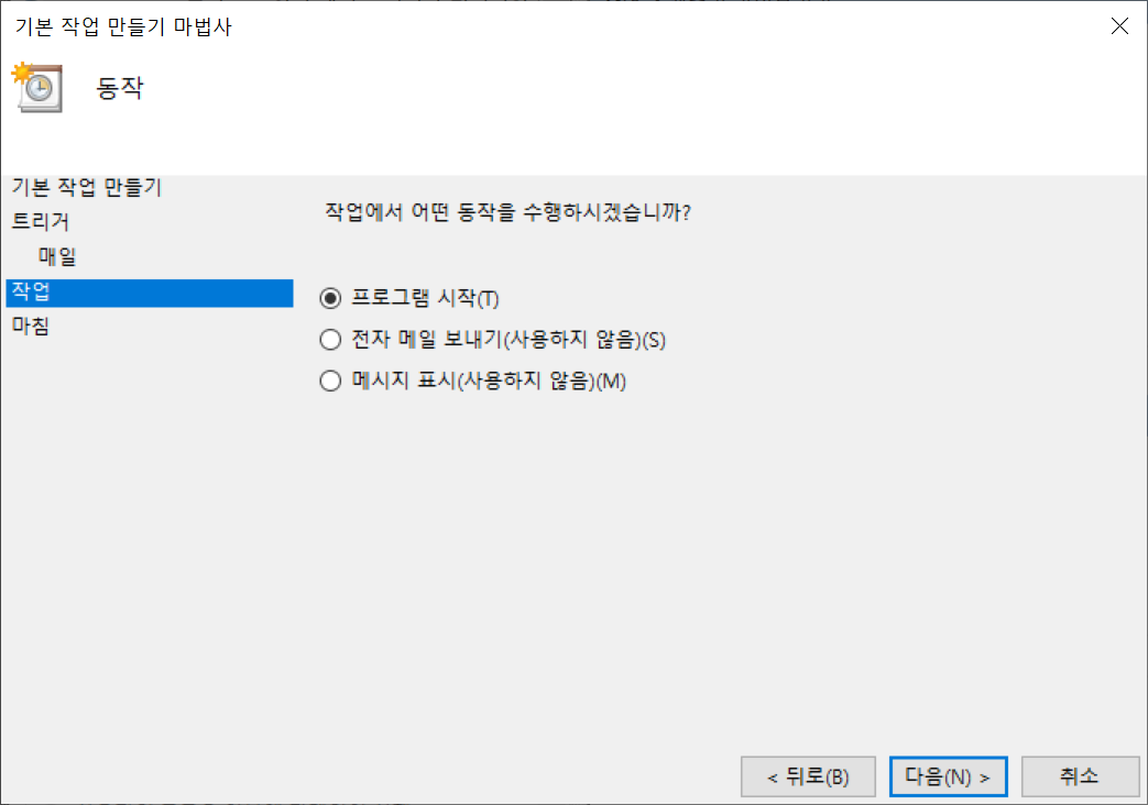 step6. 어떤 작업을 한 것인지에 대한 설정 단계입니다. 기본으로 설정된 '프로그램 시작' 그대로 다음 버튼을 클릭해주세요.