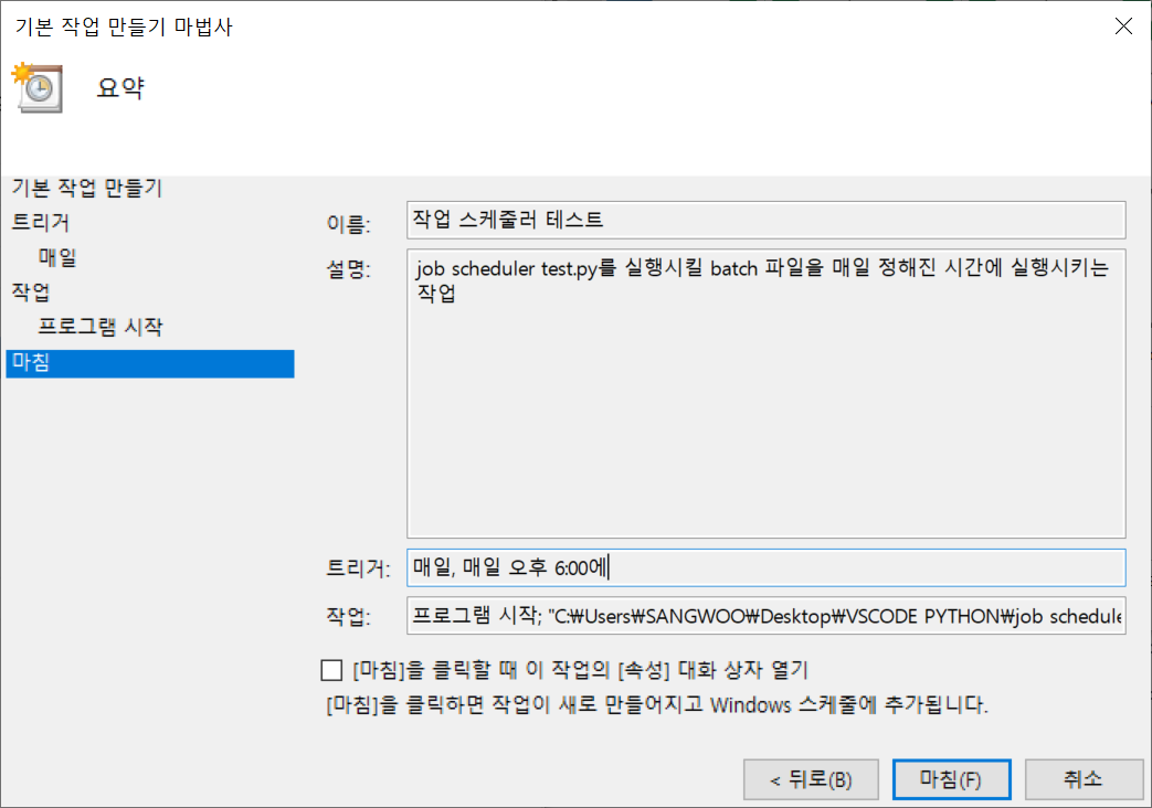 step8. 마침 버튼을 누르고 기본 작업 만들기를 완료해주세요.