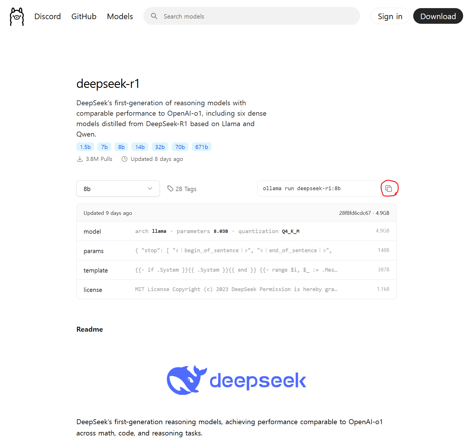 Step2. 적당한 파라미터를 선택한 후, 우측의 ollama 명령을 복사하기 버튼을 클릭해서 복사해주세요. (저는 8b를 선택하였습니다.)