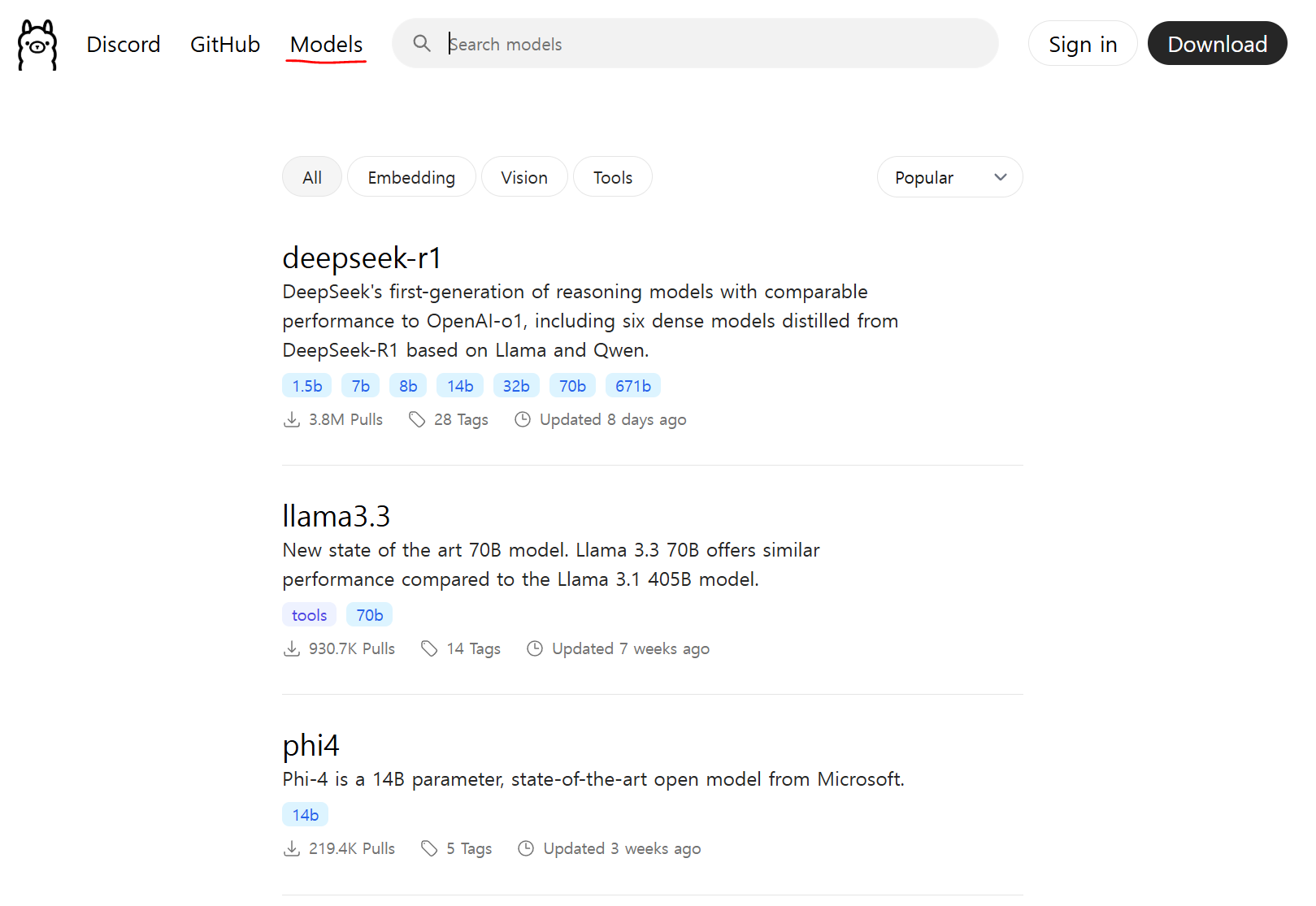 Ollama 페이지에서 "Models" 탭을 클릭해보면 Ollama를 통해 사용가능한 Local AI 모델들이 있습니다. 최근 중국에서 저비용으로 ChatGPT o1 수준의 로컬 모델을 발표해서 많은 화제가 되었던 deepseek 모델도 보입니다.
