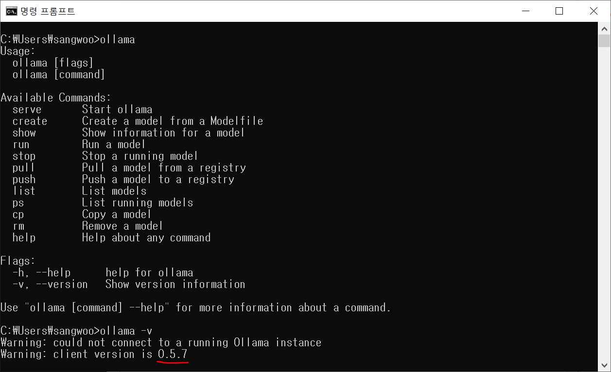 아래 명령어로 설치된 ollama 버전을 확인할 수 있습니다. ('25.01.30 기준 0.5.7 버전)