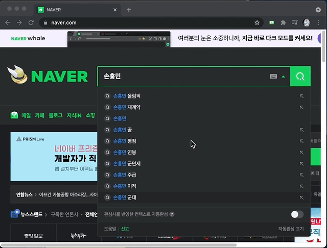 1) 네이버를 열어서 검색창에 '손흥민'을 검색합니다.