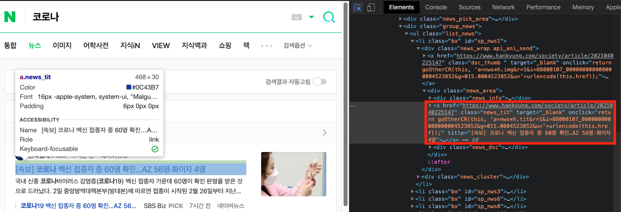 3. 화면 오른쪽에 해당 부분의 html 코드가 표시되는 것을 볼수 있습니다. 조금 더 자세히 보면 <a> 태그 안에 class="news_tit"라고 적혀있는데, 이 class라는 것은 css로 html의 태크를 꾸며줄 때, 태그를 특정지어서 꾸며줄 수 있도록 속성명을 정해놓은 것이라 생각하시면 됩니다. 참고로 네이버 뉴스의 경우 한 페이지에 10개의 제목(class="news_tit")가 있습니다.