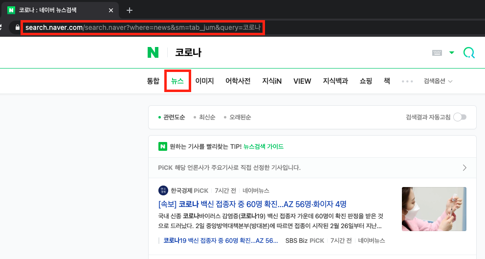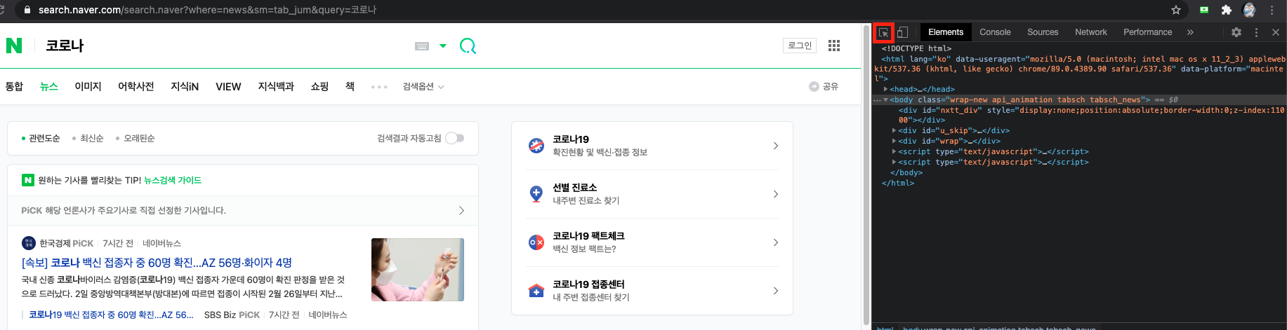 #step2.크롤링할 url 주소를 입력한다. (네이버에서 코로나 검색 후, 뉴스 탭 클릭)