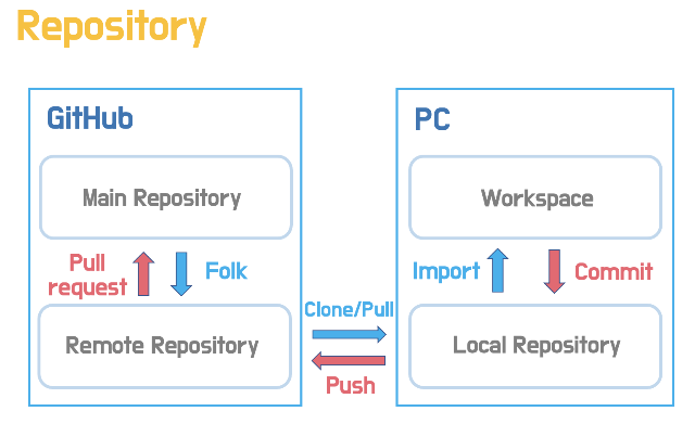 저장소(repository)는 파일이나 디렉토리를 저장하는 장소입니다. 기본적으로 PC에 존재하는 로컬 저장소에서 작업을 진행하고 그 결과를 GitHub의 원격 저장소에 저장할 수 있습니다.