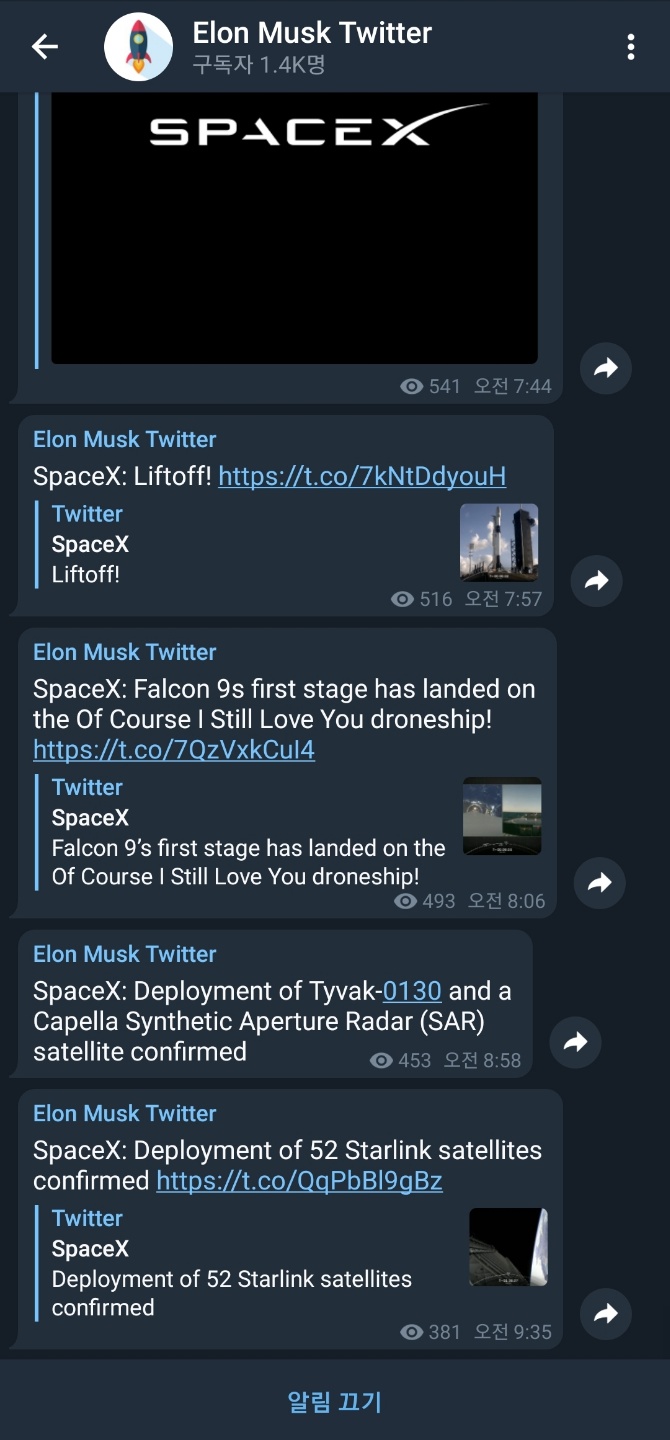 참고로, Elon Musk 개인 트위터 뿐만 아니라 SpaceX의 트위터도 실시간으로 알려주는 것으로 파악됩니다.