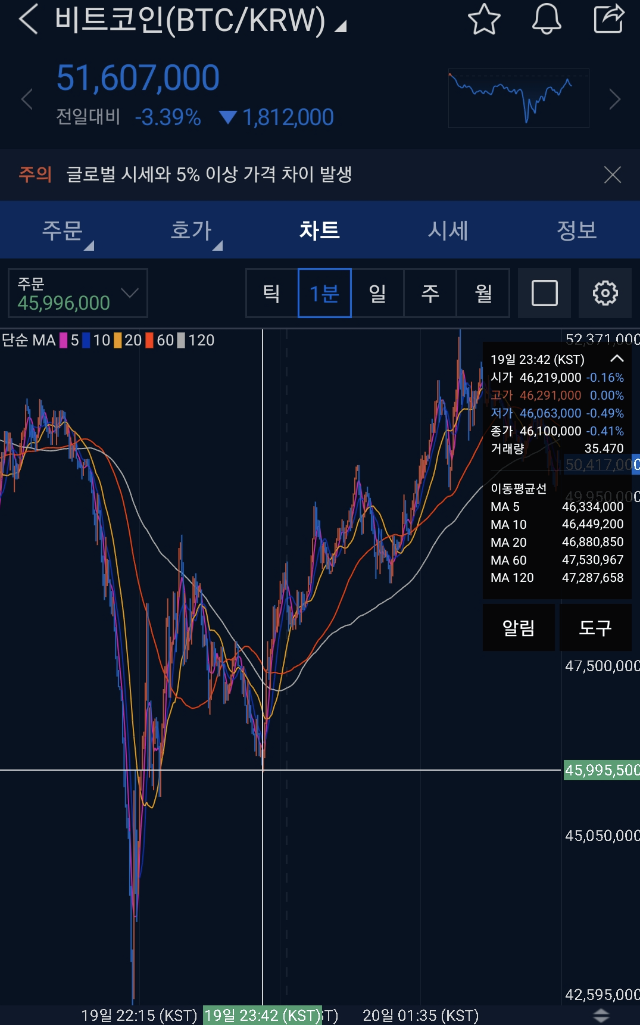 이미 제가 확인 했을 때는 1BTC에 4800만원을 왔다갔다 하고있었지만 해당 트윗이 올라왔을 때는 4600만원이 었던 걸 확인할 수 있습니다. 그리고 다음날 5시 40분 기준 5160만원인 것을 확인했습니다.