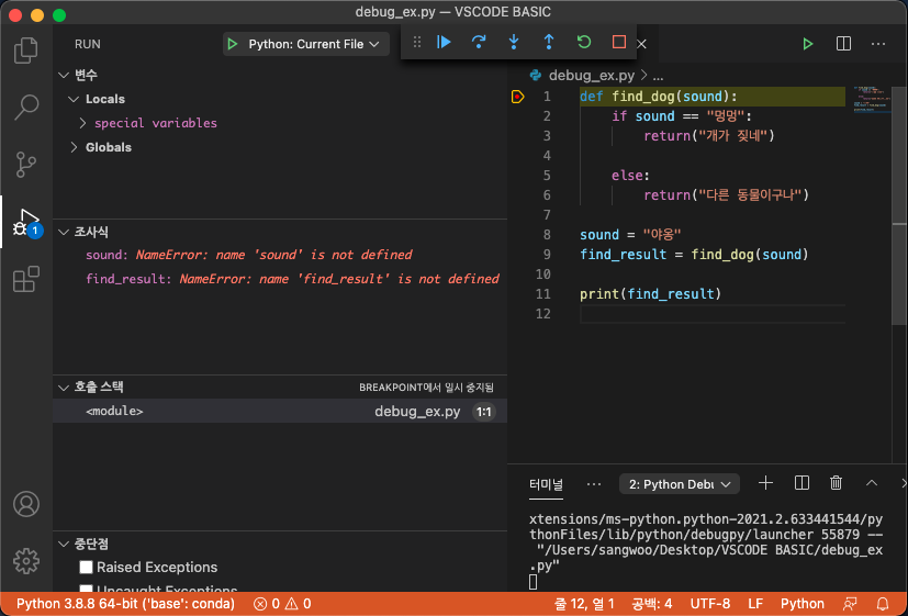저는 sound와 find_result를 입력해보았습니다. 현재는 디버깅을 시작했지만 아무것도 실행되지 않은 상태여서 해당 변수들이 정의되지 않은 상태라며 에러를 출력하고 있습니다.