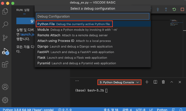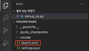 - 실행 및 디버그 버튼 밑에 launch.json 파일 만들기 를 클릭한 후, 위와 동일하게 Python File을 선택.