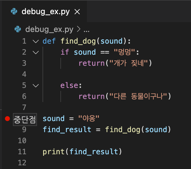 개소리("멍멍")를 입력받으면 "개가 짖네"라는 문장을 출력하고, 그 외의 경우는 "다른 동물이구나"라는 문장을 출력하는 코드입니다.