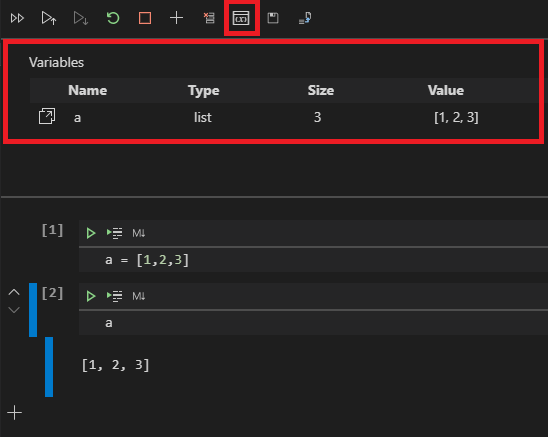 참고로, 아래의 빨간색 사각형으로 표시한 아이콘을 클릭하면 현재 사용하고 있는 변수들을 모두 볼 수 있답니다. 정말 좋지 않나요?!