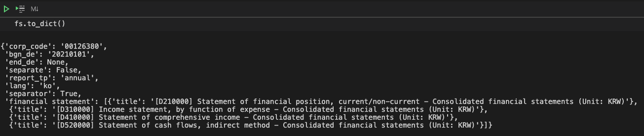 | to_dict( ) | FinancialStatement의 요약 정보를 Dictionary 로 반환 |