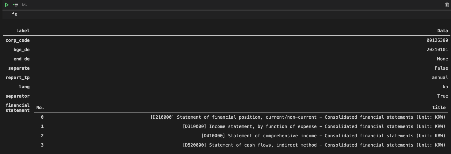 위의 코드를 실행하셨다면 위와 같이 재무제표 하나가 Dart API를 통해 다운로드 받아집니다. 변수 fs에 어떤 값이 저장되어 있는지 아래에서 확인해봅시다.