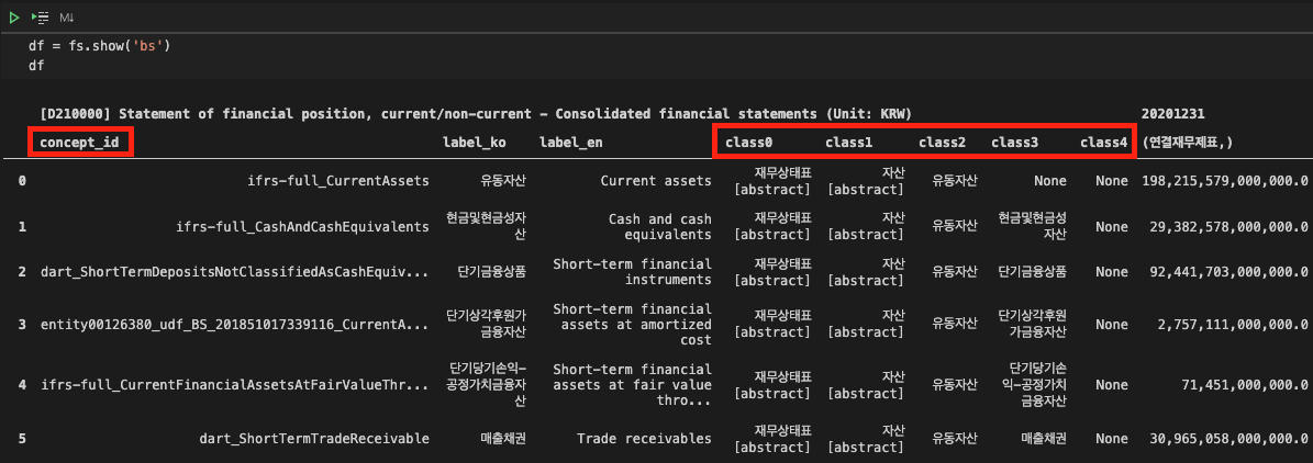 자산항목을 구분하는 id인데 아직은 어디 사용할 수 있을지 모르겠네요. 저는 한국인이니 label_ko를 이용해 자산항목을 구분할 예정입니다. concept_id를 표에서 보시기 싫으시면 show_concept = False로 설정해주시면 됩니다.