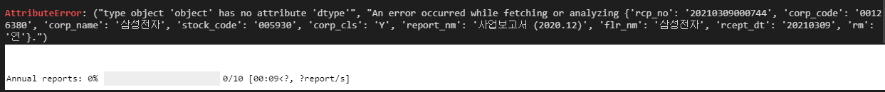 최근 제무재표를 가져오는 아래의 코드를 다른 컴퓨터에서 실행하려다가 알 수 없는 에러가 출력되어 애를 먹었습니다. 오늘은 이 에러를 해결한 방법에 대해서 공유해보려합니다.