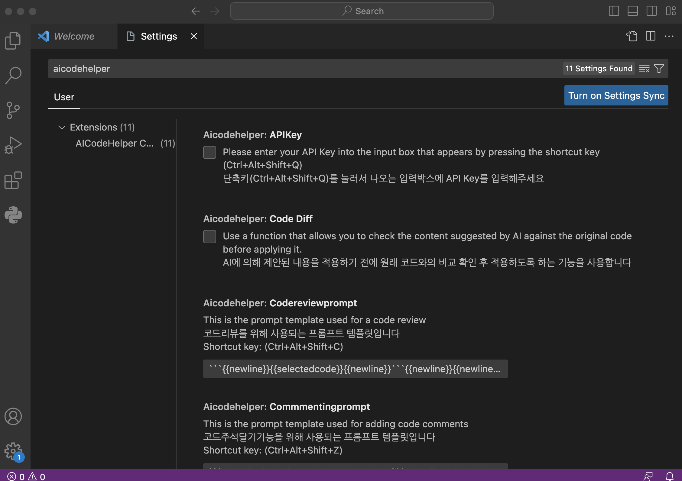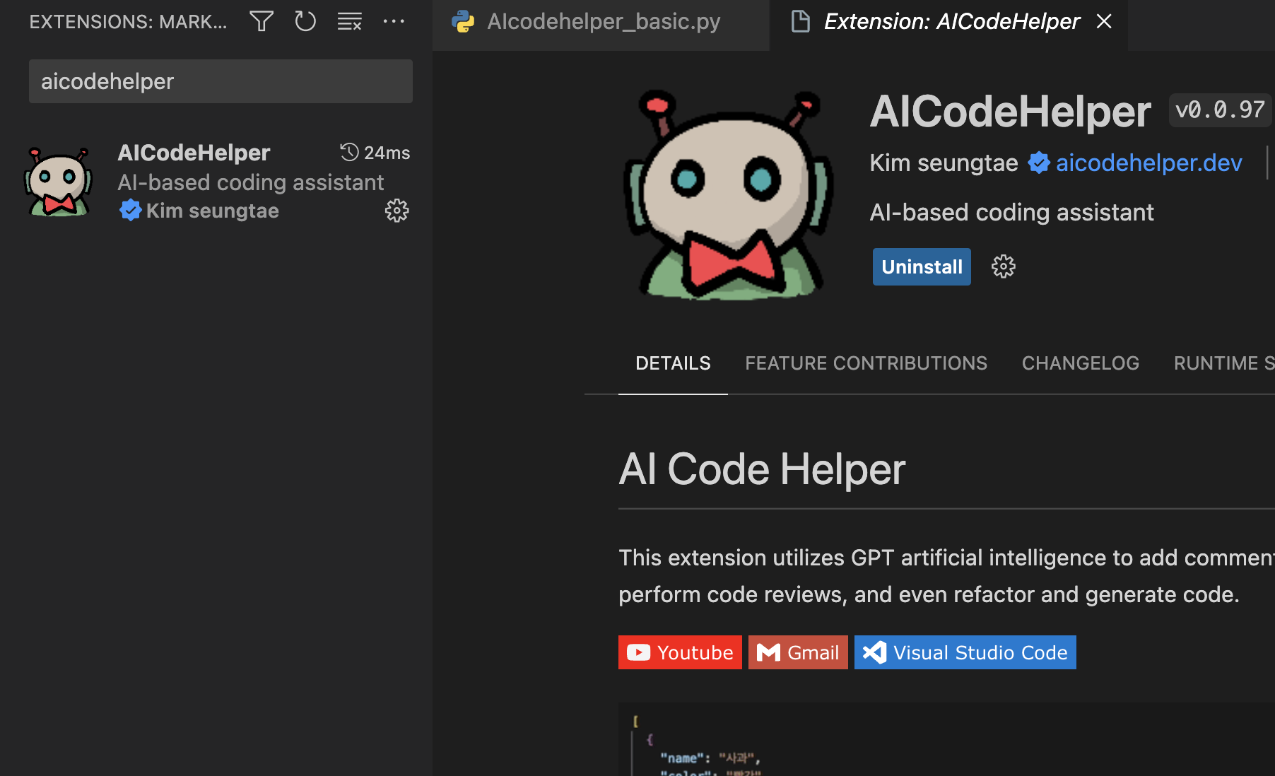 VSCODE의 좌측에 테트리스 모양의 아이콘을 클릭한 후, 검색창에 'aicodehelper'를 입력하시고 install 버튼을 클릭해서 설치를 해주세요.