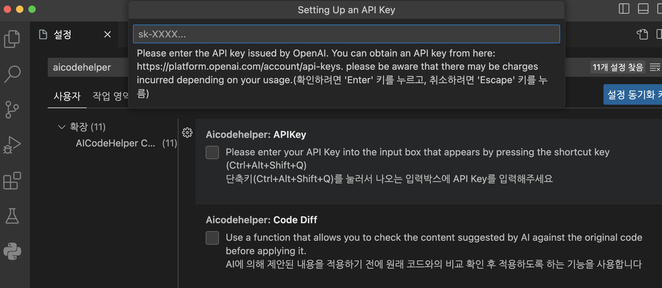 이 Extension 역시 OpenAI API를 기반으로 만들어졌기 때문에 개인이 발급받은 API key가 필요하며, 사용량에 따라서 비용이 나가게 되는 점 참고 부탁드립니다. (gpt-3.5-turbo 모델 기준: 1000개의 토큰에 약 0.002달러)